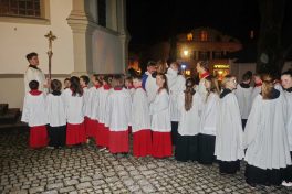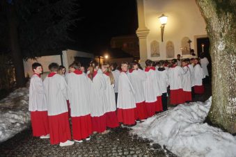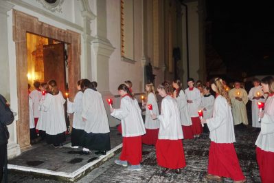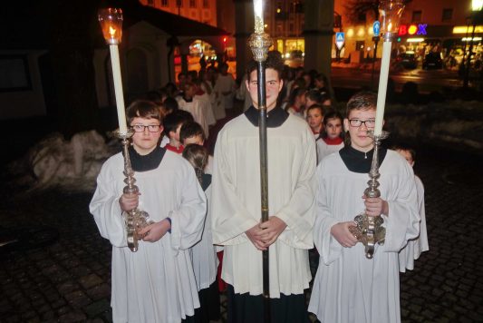 Foto/s: Hötzelsperger/Möderl – Eindrücke vom Einsatz der Ministranten bei der Maria-Lichtmeß-Feier mit Prozession – Gruppenbild mit Pfarrer Klaus Hofstetter und der bisherigen Oberministrantin Lea Palk (ganz links) und der wieder gewählten Oberministrantin Helena Wappmannsberger (gleich daneben).