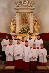 Erste Reihe von links: Fabian Fuihl, Marinus Fischer, Thomas Hamm, Dominik Till, Anna Staudinger zweite Reihe von links: die beiden neuen Oberministranten Fabian Till und Simon Staudinger, Leonie Muschalla und die beiden bisherigen Oberministranten Simon Aicher und Markus Leipert; nicht im Bild Hans Bohrer und Antonia Kommisari