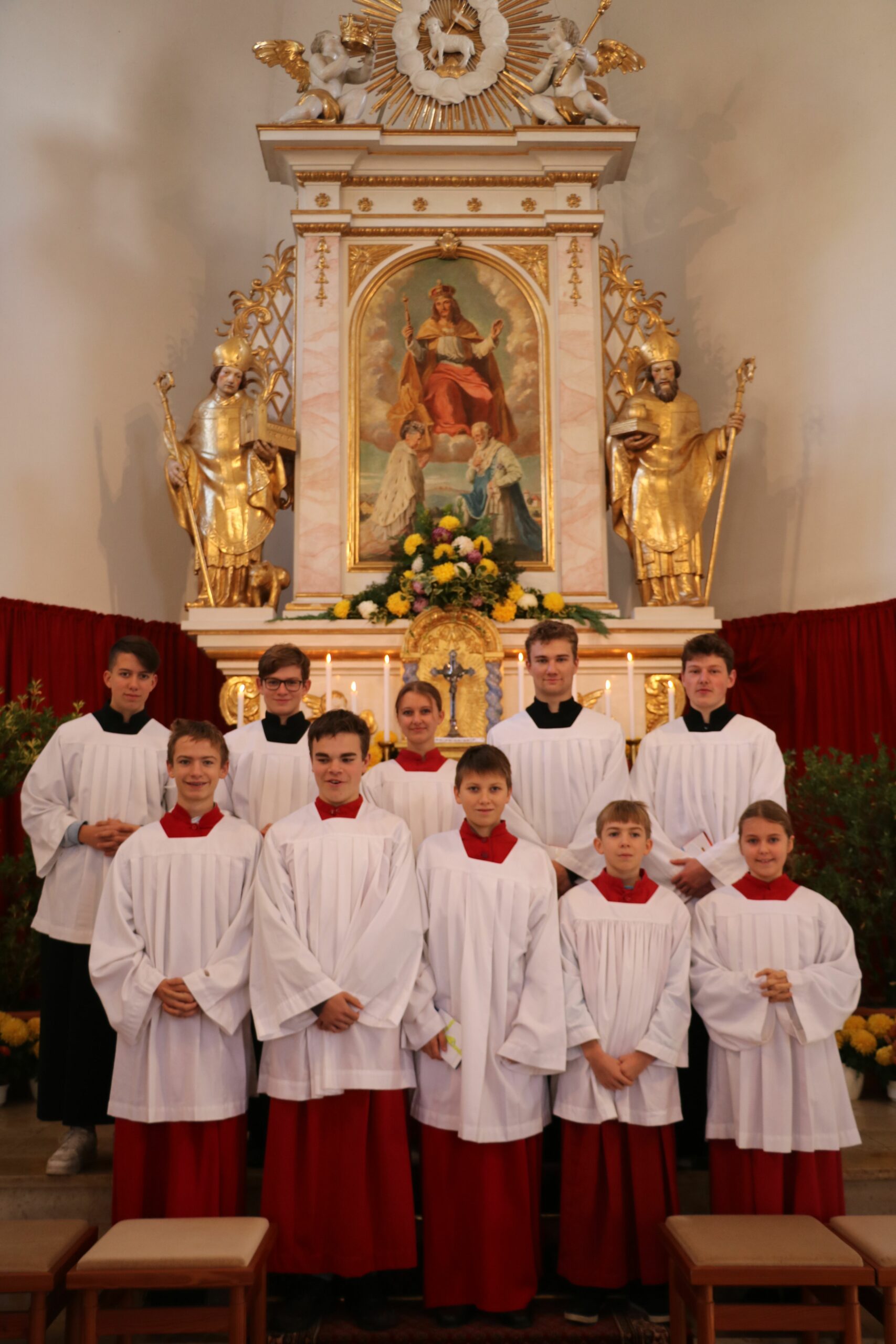 Erste Reihe von links: Fabian Fuihl, Marinus Fischer, Thomas Hamm, Dominik Till, Anna Staudinger zweite Reihe von links: die beiden neuen Oberministranten Fabian Till und Simon Staudinger, Leonie Muschalla und die beiden bisherigen Oberministranten Simon Aicher und Markus Leipert; nicht im Bild Hans Bohrer und Antonia Kommisari