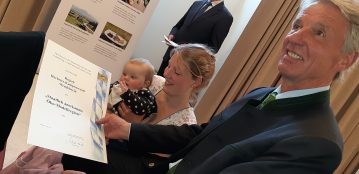 Bericht und Foto: Öko-Modellregion von links: 1. Bgm. Georg Huber, Samerberg, Stv. Landrätin Andrea Rosner, Lkr. Rosenheim, 1. Bgm. Peter Solnar, Aschau i.Chiemgau, 1. Bgm. Anton Wallner, Bad Feilnbach, Staatsministerin Michaela Kaniber, Susanne Mühlbacher-Kreuzer, Projektentwicklerin, Projektentwicklerin Christiane Voggenauer mit Tochter Marie-Elisabeth, 1. Bgm. Christian Praxl, Rohrdorf, 1. Bgm. Marianne Steindlmüller, Frasdorf, 1. Bgm. Felix Schwaller, Bad Aibling, Peter Selz, Leiter ALE Oberbayern, Landtagsabgeordneter Otto Lederer