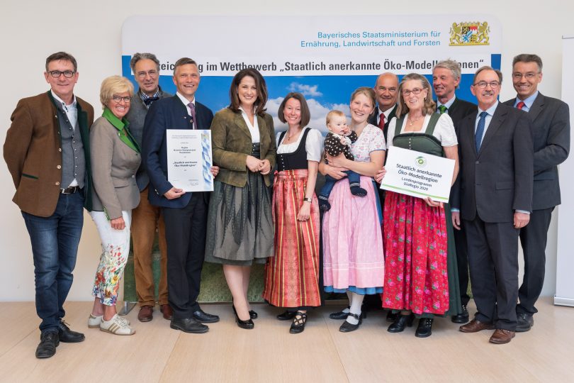 Die 15 neuen Öko-Modellregionen in Bayern können an die Arbeit gehen: Landwirtschaftsministerin Michaela Kaniber hat  den Siegern der dritten Wettbewerbsrunde ihre Urkunden überreicht. „Damit können Sie gleich loslegen, Ihre überzeugenden Konzepte in die Tat umzusetzen und damit zu einer der bayerischen Vorbildregionen in Sachen Öko-Landbau werden“, sagte die Ministerin beim Festakt im Münchner Ministerium. Insgesamt gibt es nun bayernweit 27 staatlich anerkannte Öko-Modellregionen, die aus 520 Kommunen bestehen und fast 30 Prozent der Landesfläche abdecken. Sie hatten sich in einem Wettbewerb durchgesetzt und die Jury mit ihren Konzepten überzeugt, wie sie der Produktion und dem Absatz heimischer Lebensmittel in der Region zukunftsweisende Impulse verleihen wollen.