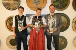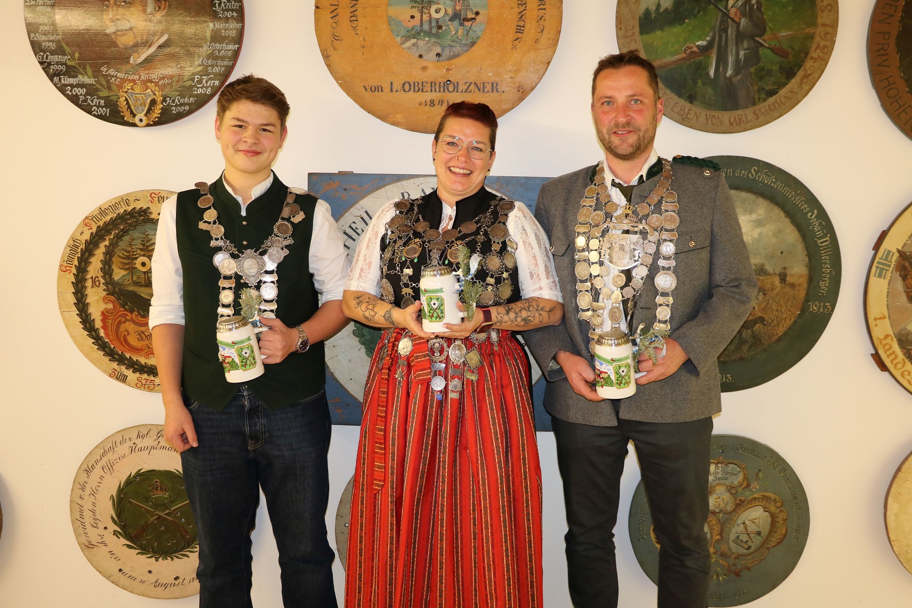 Die drei Schützenkönige der königlich privilegierten Feuerschützengesellschaft Hohenaschau 1607 (FSG Aschau), Maxi Gawlik (Jugend) – Nicole Gawlik (Luftgewehr) – Thomas Gawlik (Luftpistole) (von links)