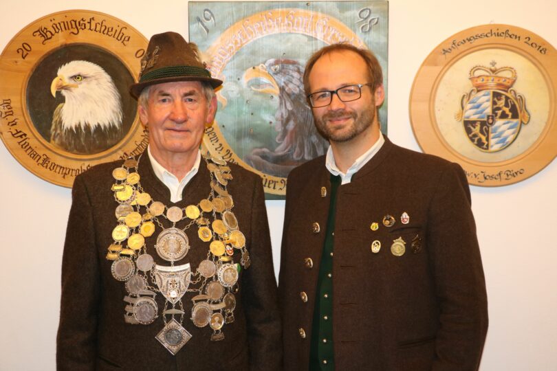 Bericht und Bilder: Heini Rehberg – Beim 62. Königsschiessen der Frasdorfer „Thomasschützen“ erzielte Sebastian Voggenauer den besten Schuss auf die Scheibe. Schützenmeister Rupert Marinus Wörndl (rechts) übergab die Schützenkette der Frasdorfer „Thomasschützen“ an Sebastian Voggenauer (links)