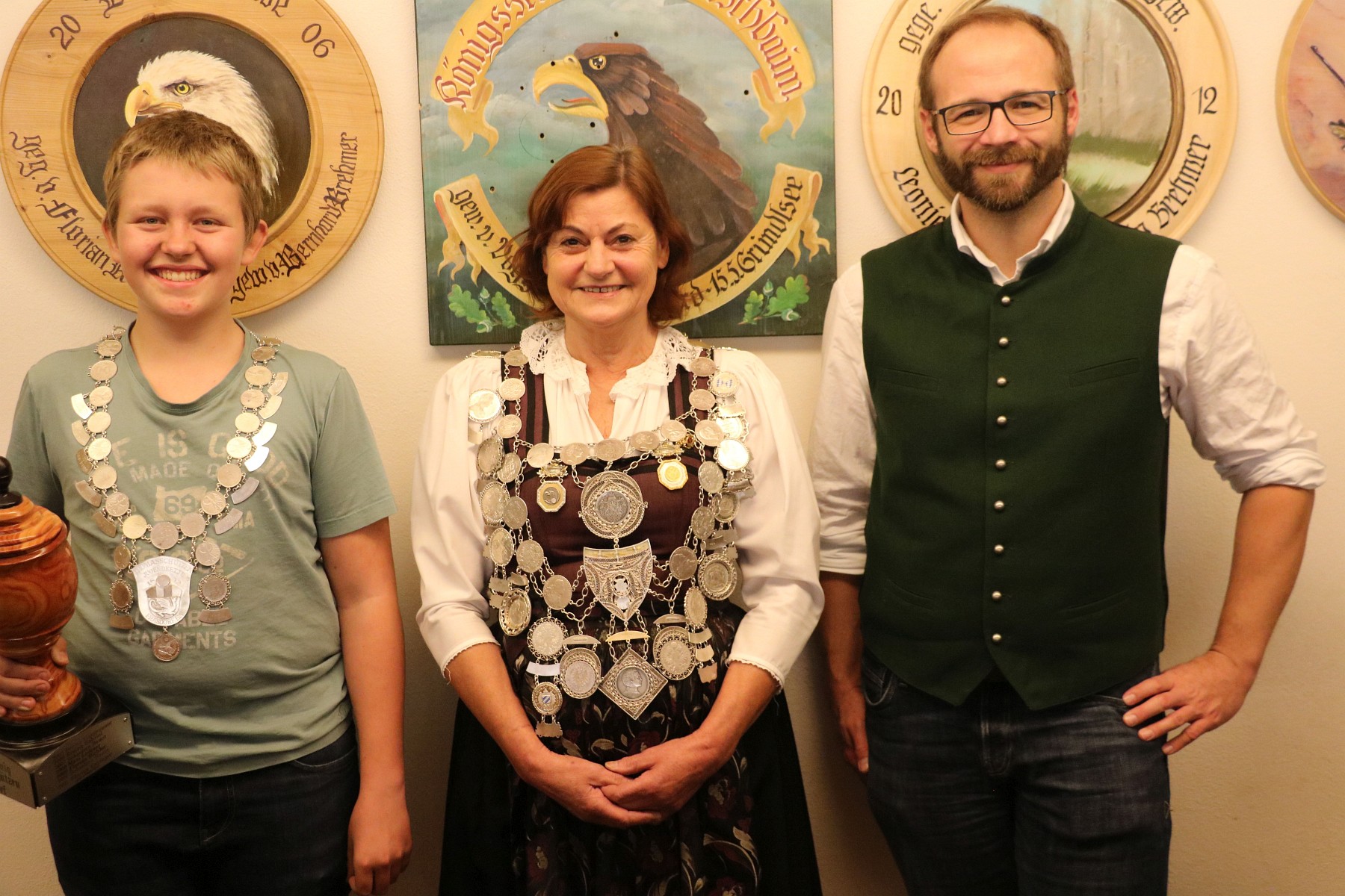 Beim 60. Königsschiessen der Frasdorfer „Thomasschützen“ erzielte Tessy Gebauer den besten Schuss auf die Scheibe. Schützenmeister Rupert Marinus Wörndl übergab die Schützenkette der Frasdorfer „Thomasschützen“ an Tessy Gebauer und die Jungschützenkette mitsamt Pokal an Paul Steindlmüller