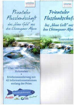 Dank der Idee und Initiative des Leiters der Tourist-Info Aschau im Chiemgau Herbert Reiter wurde im Jahr 2016 das gemeindeübergreifende Projekt „Prientaler Flusslandschaft“ auf den Weg gebracht. Mitte Mai 2021 präsentierten die Bürgermeister von Prien, Aschau, Frasdorf und Rimsting feierlich die neue Tourenkarte „Prientaler Flusslandschaft – das ‚blaue Gold‘ aus den Chiemgauer Alpen“. „Wir freuen uns, in Zusammenarbeit mit den benachbarten Gemeinden, den Freizeit- und Erholungswert der Prientaler Flusslandschaft zu stärken“, so die Geschäftsführerin der Prien Marketing GmbH Andrea Hübner. „Der Weg ist ein Naturerlebnis für Einheimische und Gäste gleichermaßen und zielt auf eine bewusste Wahrnehmung der einmaligen Natur- und Kulturlandschaft ab.“ Unterwegs mit der Wanderkarte, die im praktischen Mitnehmformat ab sofort bei den örtlichen Tourist-Informationen erhältlich ist sowie online zum Download zur Verfügung steht, erkunden Interessierte einen der längsten Wildbäche Bayerns von der Quelle bis zur Mündung in den Chiemsee. Der Erlebnisweg verbindet bei einer Gesamtlänge von 36 Kilometern 42 Stationen in vier Gemeinden entlang der Prien. In dem von Claus Linke hervorragend ausgearbeiteten Streckenverlauf im Maßstab 1:35.000 sind zudem Bushaltestellen sowie Standorte von Kirchen und bewirtschafteten Almen und Berggasthöfen eingezeichnet. Ob zu Fuß, mit dem Rad oder in Teilstrecken mit dem Bus wird man hier von den beiden Regenbogenforellen Toni und Vroni begleitet und erfährt Wissenswertes zur geologischen Entstehungsgeschichte, Lebensweisheiten aus aller Welt sowie besinnliche Anmerkungen von Aschauer, Frasdorfer, Priener und Rimstinger Bürgern, festgehalten auf bunt gestalteten Holzstelen.