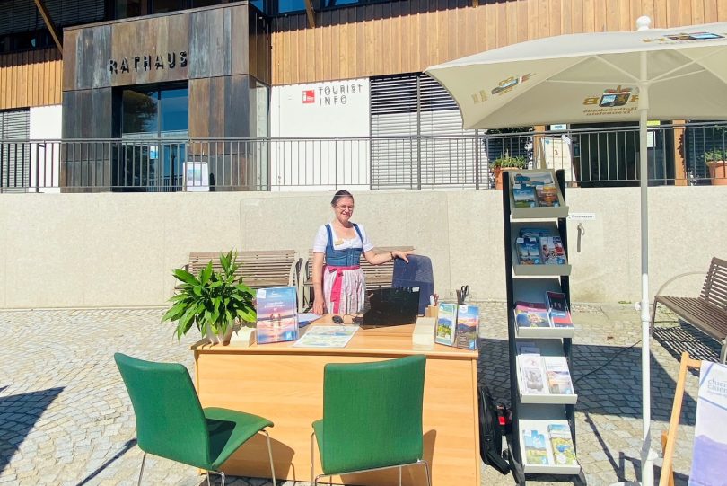Sonniges Wetter und ein blauer Himmel – so sieht der Arbeitsplatz heute für Anna Esterlechner aus. Unter dem Motto „Urlaubsgäste informieren – mal anders“, hat die Tourist-Information Seebruck kurzerhand eine Außenstelle vor dem Rathaus eröffnet. Ein besonderer Hingucker auf dem Rathausvorplatz. Da der Chiemsee Uferweg hier direkt vorbeiführt, kommen viele Radfahrer und Spaziergänger vorbei und bleiben bei diesem ungewöhnlichen Bild stehen. „Die Idee einer Außenstelle der Tourist-Information war schon länger im Gespräch“, so Anna Esterlechner, Leiterin der Tourist-Information. „Jetzt ist der perfekte Moment. Das ist unsere Antwort auf die 3-G-Regel. Wir machen es den Gästen leichter und kommen zu Ihnen, direkt vor Ort.“