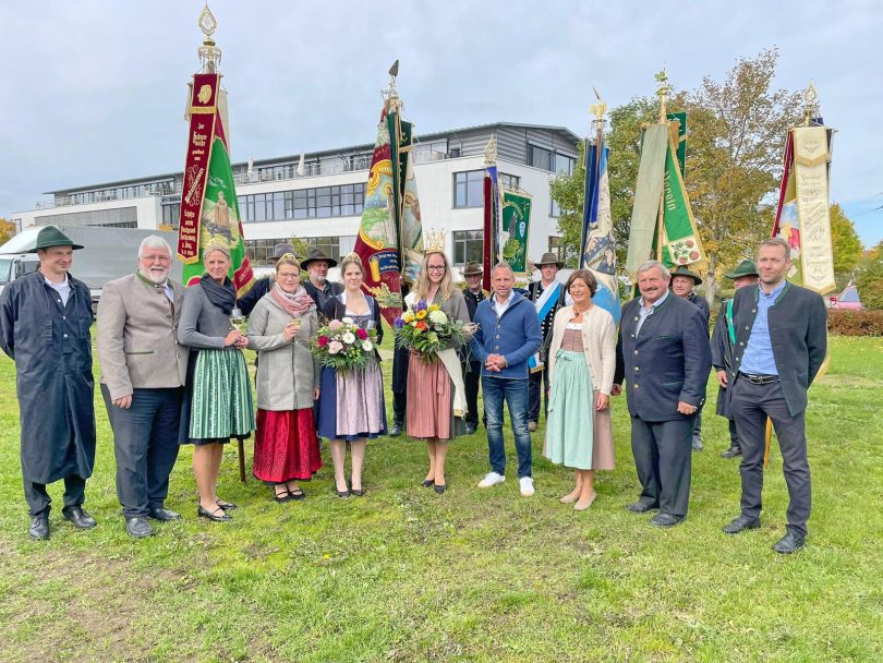 - Staudacher– nach der Krönung von links: Martin Brickl (Vorsitzender der Bayerischer Wollerzeuger-Gemeinschaft), Oberbayerischer Bezirksrat Sebastian Friesinger, Wollköniginnen-Mutter und erste Bayerische Wollkönigin vor 27 Jahre Anja Staudacher, ehemalige Wollkönigen Claudia, abdankende Wollkönigin Franziska Lechner, Janine Staudacher, neue Bayerische Wollkönigin, Staats- und Umwelt-Minister Thorsten Glauber, Zweite Bürgermeisterin von Vaterstetten Maria Wirnitzer, stellvertretender Landrat von Ebersberg und gastgebender Hof, Georg Reitberger und Martin Bartl, Geschäftsführer vom Landesverband Bayerischer Schafhalter.