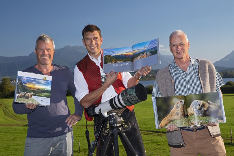 Die Freude ist groß bei den beiden Autoren: Fotograf Josef Reiter (Bildmitte) und Textautor Reinhard Rolle (rechts) über das beeindruckende Buch, das der Verleger Max Scheibmair (links) im Chiemgauer Verlagshaus aus Breitbrunn am Chiemsee soeben veröffentlicht hat.