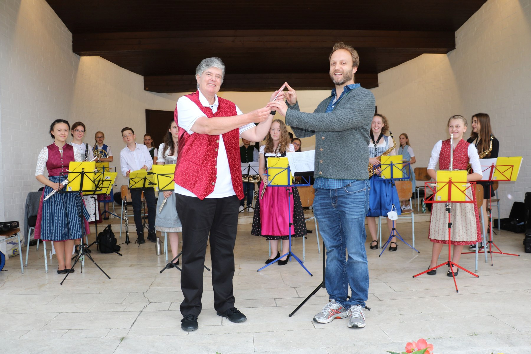 Die scheidende Dirigentin der Aschauer Jugendkapelle Capucine Mühlbauer übergab den Dirigentenstab und die Verantwortung für das Orchester weiter an Josef Steiner.