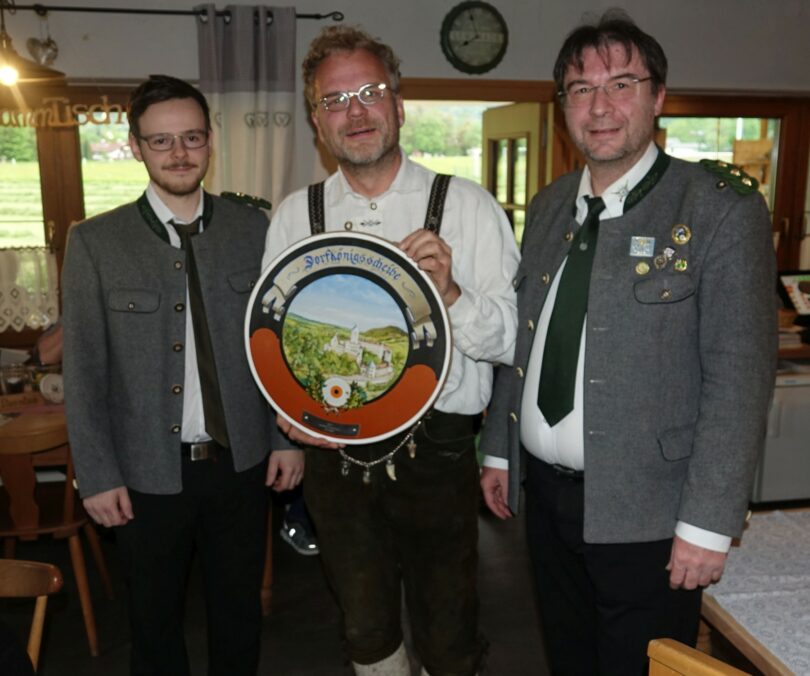Bildunterschrift: Manfred Kronstaller (Mitte) ist der Sieger beim 14. Dorfkönigsschiessen der Königlich privilegierten Feuerschützengesellschaft (FSG) Hohenaschau. Bei der Siegerehrung in der Schiessstätte überreichte Schützenmeister Franz Kiesmüller junior (rechts) zusammen mit seinem Stellvertreter Alexander Thanhäuser dem besten Schützen des Dorfes die Siegerscheibe 2023.