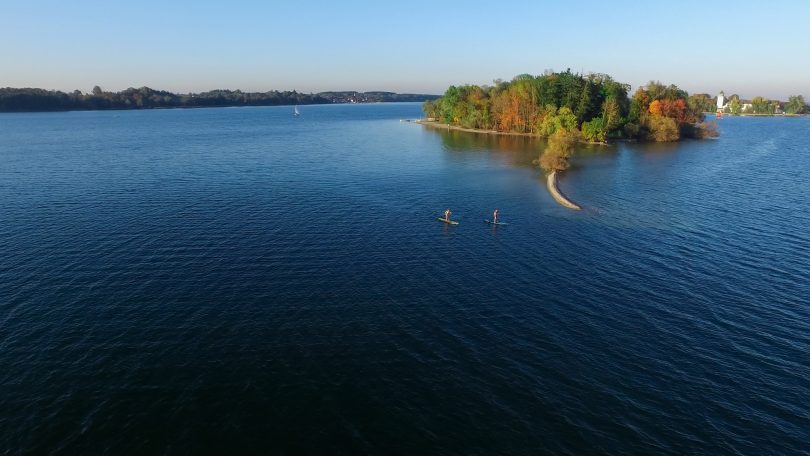 Bildrechte: Prien Marketing GmbH – Wingmen Media – Bildunterschrift: Luftaufnahmen vom Stand Up Paddling um die Krautinsel sind im Werbespot der Prien Marketing GmbH zu sehen.