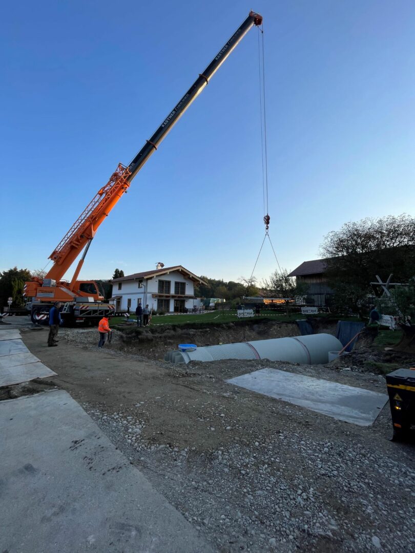 Der 17 Meter lange zylindrische Kunststoffbehälter mit einem Durchmesser von 3 Metern wurde mittels Schwertransport zur Baustelle transportiert und mit einem Autokran in die vorbereitete Baugrube eingehoben. Die Gemeinde Aschau hat mit dieser Maßnahme nun den langersehnten und dringend benötigten Brandschutz im Ortsteil Höhenberg sichergestellt.