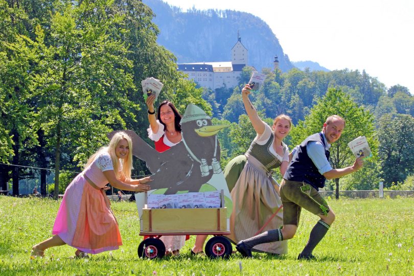 In Aschau sind gerade alle im Jagdfieber. Passend zu den Sommerferien freut sich die Tourist Info einen neu ausgearbeiteten Kinder Schnitzeljagden-Führer herausgegeben zu können. In Zusammenarbeit mit der Aschauer Grafikerin Cristina Wimmer konnte die Tourist Info ein 68- seitiges Kinderheft erstellen. Ansprechende Illustrationen und kindgerechte Texte sollen so noch mehr Lust machen Aschau und Sachrang individuell zu erkunden. Von der Bankerlrunde, über Gondel- und Schlossrunde über die Wasserfallrunde gibt es noch vier weitere Runden im Bergsteigerdorf Sachrang. Für Bergfreunde kommen dank der Gipfelstürmer-Tour auch nicht zu kurz. Neu hinzu kommt, dass ein spezielles Maskottchen für das Bergsteigerdorf Sachrang geschaffen wurde – Berta das Murmeltier. Berta und Florian die Kampendohle freuen sich schon darauf, ihre schöne Heimat im Priental vorzustellen. Besondere Freude herrschte beim Team der Tourist Info zusammen mit Cristina Wimmer (Zweite von links), als die ersten druckfrischen Exemplare im Bankerldorf anrollten.