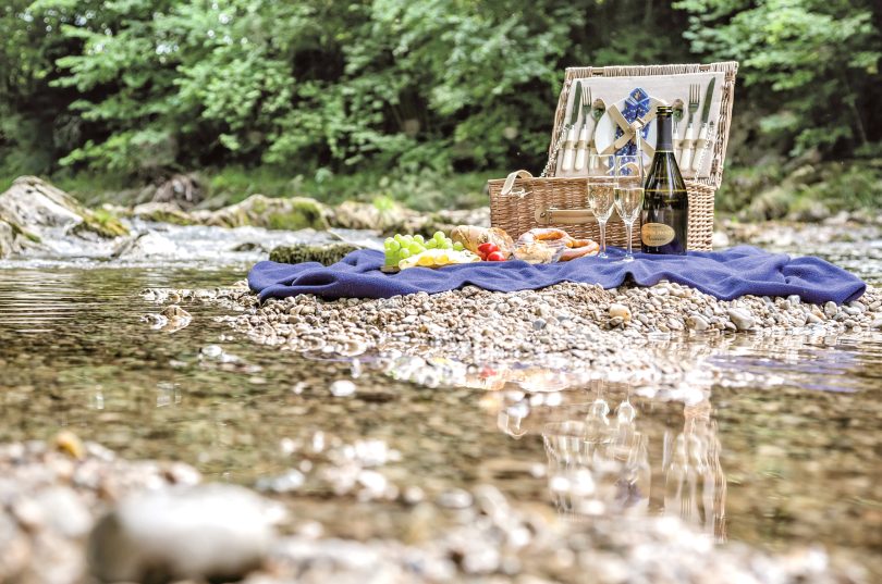 Foto: Prien Marketing GmbH: Das Titelbild des Restaurantführers „Genussort Prien“ zeigt ein unterwegs eingesammeltes „Do it yourself“-Picknick mit Produkten heimischer Lebensmittelerzeuger:innen.
