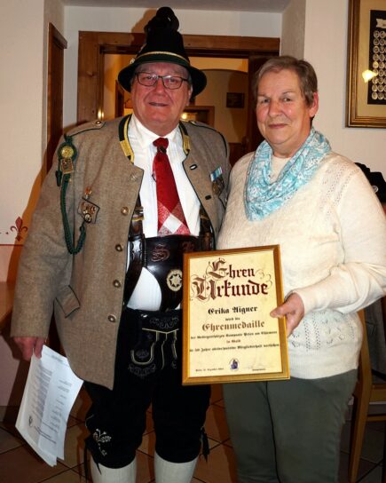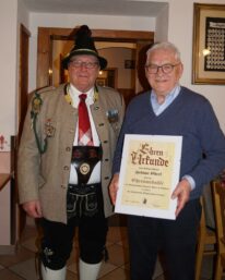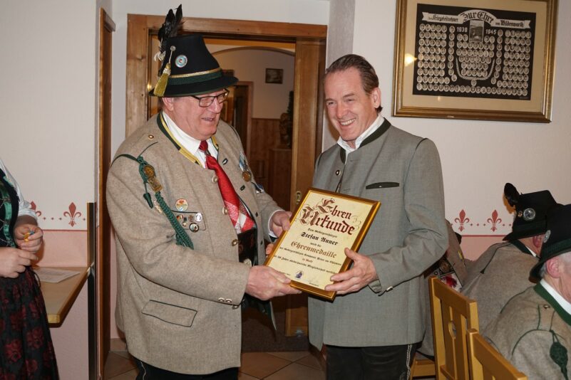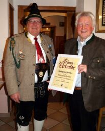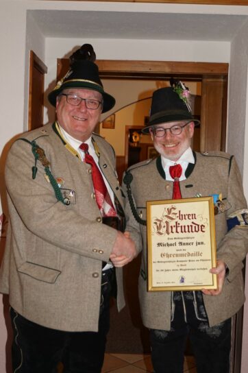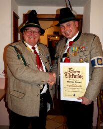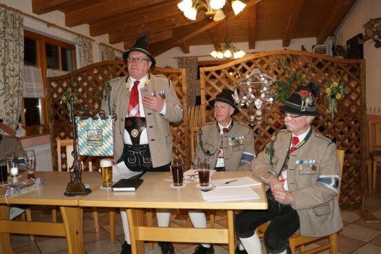 Zum Schluss folgten wie immer die Ehrungen langjähriger aktiver und passiver Mitglieder durch den Hauptmann. Jörg Ott erhielt die „Ehrenmedaille der Kompanie in Bronze,“ Markus Rappel, Helmut Eberl, Christian Späth und Wolfgang Fischer erhielten die „Ehrenmedaille der Kompanie in Silber.“ Die „Ehrenmedaille der Kompanie in Gold“ für 50 Jahre aktive/passive Mitgliedschaft erhielten Erika Aigner, Michael Anner jun. und Stefan Anner.