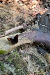 Es wimmelt, wuselt, flattert und brummt. Tausende kleiner, weißgelber Maden ringen am und im Kadaver um die besten Plätze auf der Suche nach einem Maulvoll Aas. Ein Mohrenfalter tupft mit seinem Rüssel Salze und andere Nährstoffe von der Haut des toten Rehs. Aaskäfer legen unzählige Eier ab und Wespen erbeuten fleißig Käferlarven. Es ist eine friedliche, wenn auch etwas ungewöhnlich anmutende Szenerie. Der Körper des Rehbocks ist übersät von Millionen Lebewesen und der Kreislauf des Lebens beginnt unzählige Male von Neuem.
