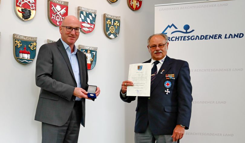 Foto: LRA BGL –  Landrat Bernhard Kern (links) überreichte Rudolf Schierghofer für seine jahrzehntelangen ehrenamtlichen Verdienste die Landkreismünze in Silber.