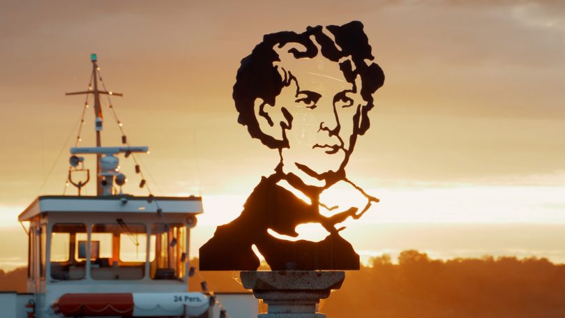 Bildunterschrift: Zu Beginn des Imagefilms „Kunst in Prien am Chiemsee“ sieht man das Kunstwerk von Walter Angerer „König-Ludwig-II-Porträt“ am Hafen von Prien-Stock.