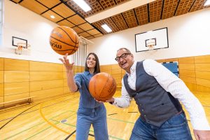 Sandra Rieß und Volker Heißmann mit jugendlichen der Bayerischen Landesschule.