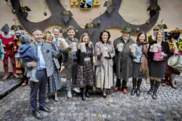 - Umrahmt von den Traunsteiner Pfeifferlbuam im Innenhof der Brauerei: Traunsteins Oberbürgermeister Christian Hümmer, stellvertretende Landrätin Resi Schmidhuber, Kolja Zimmermann LAG Manager der LEADER Geschäftsstelle Chiemgauer Alpen, Maximilian und Birgit Sailer vom Hofbräuhaus Traunstein, Staatsministerin Michaela Kaniber, Bernhard und Christa Sailer sowie Katharina Gaßner, Marketingleiterin vom Hofbräuhaus Traunstein