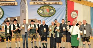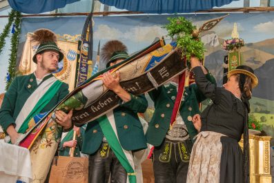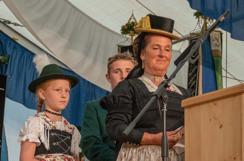 Vor 45 Jahren war Anja Voit das erste Trachtendirndl im Oberwössner Trachtenverein D’Rechlberger. Die heutige Brauchtumswartin des Chiemgau-Alpenverbandes arbeitete bald darauf 23 Jahre als Jugendleiterin im Verein. Noch im Gespräch mit unserer Zeitung freut sie sich, dass sie damals ihre Schützlinge immer wohlbehalten heim brachte. „Nie ist etwas passiert. Da war es mir ein Anliegen ein Fahnenband zu stiften“, erklärt sie. Sie selbst hat das Fahnenband in Handarbeit erstellt, das sie im Festgottesdienst am Sonntag überbrachte und an der jungen Fahne des Trachtenvereins befestigt.