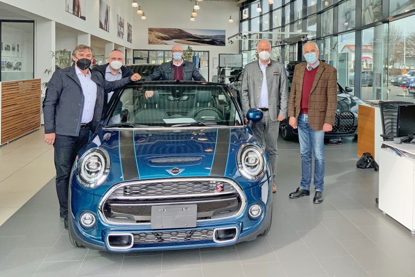 Bildtext-Vorschlag: Die Auszubildenden dürfen sich auf ein neues MINI Cooper S Cabrio freuen. Bei der Fahrzeugübergabe waren (von links) Richard Wagner (BMW Wagner), Georg Zieglmeier, Martin Wiedmann, Harald Magerl (BMW-Group) und Gerhard Heindl dabei.