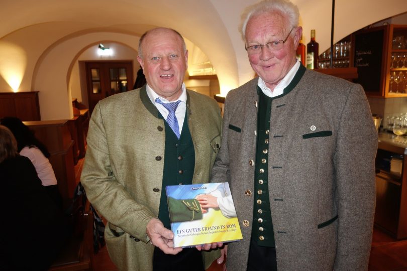 Das fast 300seitige Werk „EIN GUTER FREUND IN ROM – Bayerische Gebirgsschützen begleiten Joseph Ratzinger“ wurde nach umfangreichen Vorarbeiten wurde in diesen Tagen von Günter Reichelt aus Rosenheim herausgebracht. Der Schatzmeister vom Bund der Bayerischen Gebirgsschützen hat in diesem Buch mit vielen Farbbildern den Werdegang von Joseph Ratzinger von seiner Chiemgauer Heimat bis zum höchsten Amt in der Katholischen Kirche festgehalten und dabei besonders die Verbundenheit von Joseph Ratzinger mit den Bayerischen Gebirgsschützen herausgestellt. Eines der ersten Exemplare überreichte Günter Reichelt an den Bayernbund-Kreisvorsitzenden Christian Glas, dieser bedankte sich dabei mit den Worten: „Gute Freunde über Bayern hinaus zu haben ist allein schon eine große Freude, doch zugleich dient dieses Buch all jenen, die sich für Bayern und ihre Geschichte interessieren“.