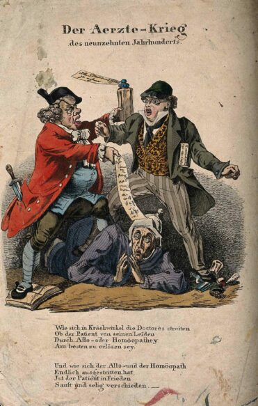 Im Jahr 1796 erschien mit Samuel Hahnemanns „Organon der rationellen Heilkunde“ die „Bibel d“ der Homöopathen. Zunächst stieß das Werk auf geringe Resonanz, dann gab es jedoch Berichte über sensationelle Heilerfolge. In diese Zeit gehört auch die Karikatur zum Streit der Ärzte – während sich der Schulmediziner und der Homöopath streiten ist der Patient „sanft und selig verschieden”. Weitere Hintergründe zur Geschichte der Homöopathie in Bayern und anderen Gesundheits-Themen liefert das HDBG Magazin Nummer 10 „Gsund samma. Wie man in Bayern mit der Gesundheit umging“. © Wellcome Collection | Public Domain Mark