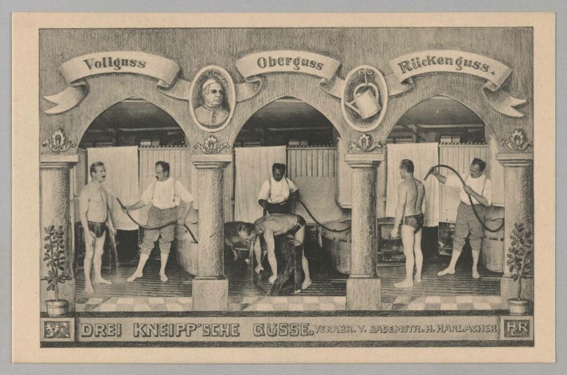 Ansichten drei verschiedener Kneipp-Güsse aus der Wasserkur Sebastian Kneipps auf einer Postkarte um 1910. Der „Wasserdoktor“ Sebastian Kneipp hatte ein ausgeklügeltes System von Teilanwendungen heilenden Wasser entwickelt: Knieguss, Schenkelguss, Unterguss, Rückenguss, Armguss, Oberguss, Kopfguss, Gesichtsguss und wie sie alle heißen. Weitere Hintergründe zum Heiler Kneipp und anderen Gesundheits-Themen liefert das HDBG Magazin Nummer 10 „Gsund samma. Wie man in Bayern mit der Gesundheit umging“. © Haus der Bayerischen Geschichte
