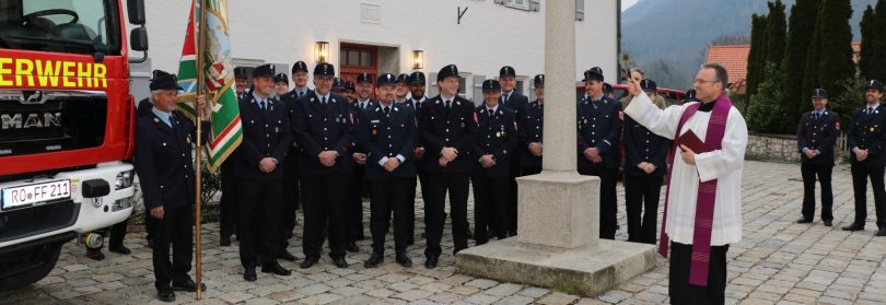 „Allzeit gute Fahrt, Gottes Segen und eine gute Heimkehr für alle nach jedem Einsatz“! wünschte Pfarrer Paul Janßen allen Aschauer Feuerwehrleuten und segnete das neue Tanklöschfahrzeug TLF 3000 auf dem Aschauer Kirchenplatz unmittelbar neben dem Hl. Korbinian.