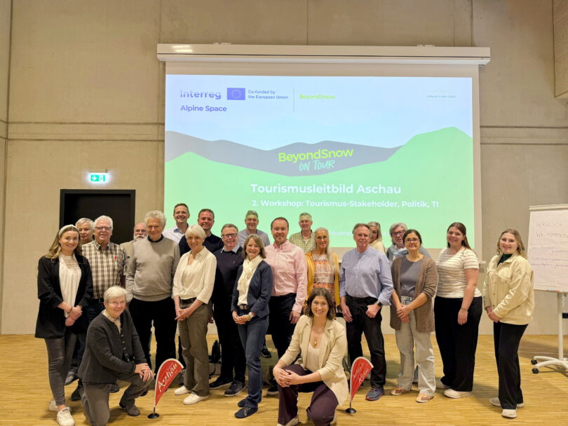 Bereits im Vorfeld des Workshops fand eine erste Arbeitssitzung mit den drei Aschauer Bürgermeistern, den Fraktionssprechern der Gemeinderatsgruppierungen sowie dem Team der Tourist Info statt. Ziel dieser Zusammenkunft war es, im Rahmen einer SWOT-Analyse (Stärken, Schwächen, Chancen und Risiken) eine gemeinsame Ausgangsbasis zu erarbeiten und eine breite Abstimmung für den weiteren Prozess sicherzustellen. Moderiert wurde der Workshop von Katharina Gasteiger (Vorne kniend Mitte) vom Gemeindenetzwerk “Allianz in den Alpen” (AidA). Die Veranstaltung fand im Rahmen des Projekts BeyondSnow statt, an dem AidA als Partner beteiligt ist. Einigkeit herrschte unter den Teilnehmern darüber, dass der Tourismus in Aschau i.Chiemgau und im Bergsteigerdorf Sachrang gut funktioniert. Aschau i.Chiemgau nimmt im Tourismus bereits heute eine führende und innovative Rolle ein.