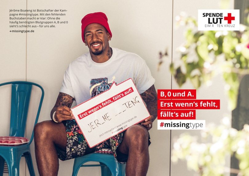 Botschafter der Kampagne ist FC Bayern München-Star und Fußball-Weltmeister Jérôme Boateng: „Gerade in schwierigen Zeiten ist es wichtig, füreinander da zu sein. Mit #missingtype setzen wir gemeinsam ein großes Zeichen für die Blutspende.“
