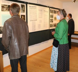 Bericht und Fotos: Heinrich Rehberg – Eröffnung der Ausstellung zu „Tod und Leichenzug von König Ludwig III. und Königin Marie Therese“ unter Corona-Bedingungen im Alten Schulhaus mit dem Vorsitzenden des Frasdorfer Heimat- und Kulturvereins Rupert Wörndl (links) und Bürgermeister Daniel Mair (rechts)