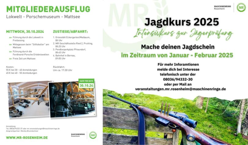 Am kommenden Mittwoch, den 30. Oktober, organisiert der Maschinenring Rosenheim den jährlichen Mitgliederausflug. Dieser führt zunächst zu den „Lokwelten“ in Freilassing und anschließend weiter zum Mattsee. Dort geht es nach einer kleinen Stärkung weiter in die „Ferdinand-Porsche Erlebniswelten“. Dort besteht die Möglichkeit, die Ausstellung in Ruhe zu erkunden oder einen Spaziergang am Mattsee zu unternehmen. Eine Anmeldung ist telefonisch unter 08036/94332-37 oder per Mail an veranstaltungen.mr.rosenheim@maschinenringe.de möglich.