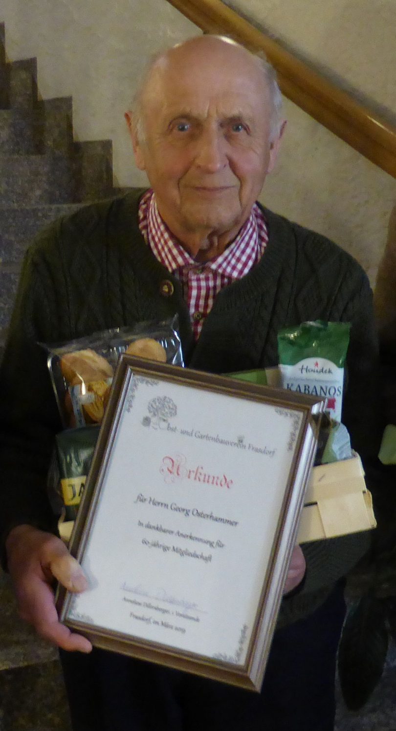 Bericht und Foto: Heinrich Rehberg – Ehrenvorstand Georg Osterhammer erhielt bei der gut besuchten Jahresversammlung im Gasthof Hochries die Ehrenurkunde für 60-jährige Mitgliedschaft aus der Hand der Vorsitzenden des Obst- und Gartenbauvereins Frasdorf Anneliese Dillersberger.