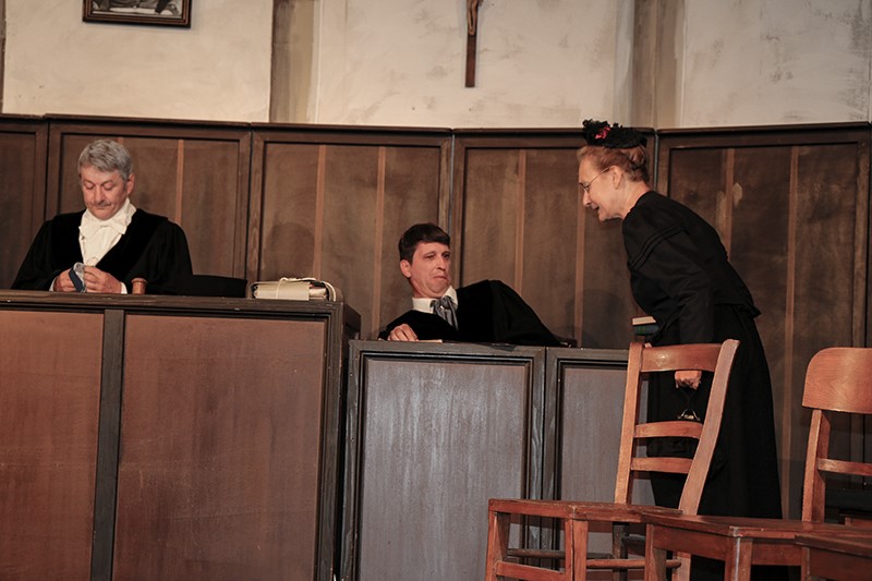 Auch Paula Aiblinger als stets auf Sittlichkeit bedachte Pfarrhaushälterin und Ina Siferlinger als Stadlbäuerin, die um ihren Gockel trauert, erhielten großen Applaus und viele Lacher, während sie sich im Gerichtssaal gegenseitig an die Gurgel gingen und sogar den über das ganze Stück hinweg mürrisch dreinschauenden Staatsanwalt (den spielt meine Wenigkeit) aus der Fassung brachten.