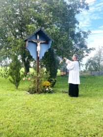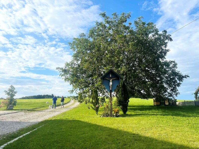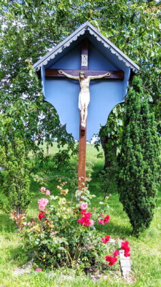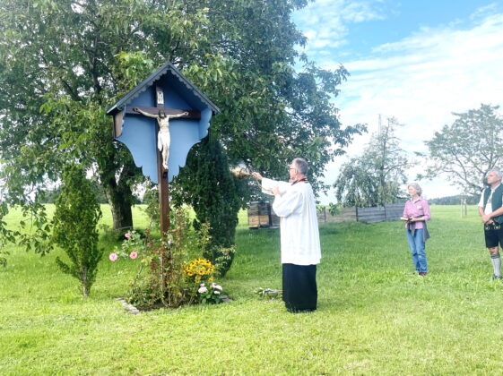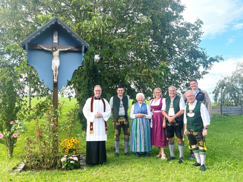 Pfarrer Janßen bezeichnete das Kreuz als wichtiges Zeichen am Wegrand und für die dort wohnenden und vorbeikommenden Menschen und sagte: „Das Kreuz erinnert uns daran, dass wir auf Gottes Segen angewiesen sind, nicht Alles im Leben haben wir in der Hand, letztlich liegt unser Leben in Gottes Hand. Unser Leben ist ein Geschenk des Schöpfers und so wollen wir in unseren oft nicht einfachen Situationen einen Blick auf das Kreuz werfen, denn auch Jesus hat den Tod überwunden“. Für die Erneuerung des Kreuzes waren Mathias Reiserer und Paul Panzer hauptverantwortlich. Der junge Reiserer, Neffe von Alois Heinrich senior, dem Besitzer des Platzes mit dem Kreuz, hat all die zum Teil verfaulten und kaputten Holzteile erneuert. Und Paul Panzer, Ehrenoberleutnant der Priener Gebirgsschützen und ebenfalls ehrenamtlich in gut 40 Stunden tätig hat dem gesamten Werk mit Corpus Christi, Kreuzbalken und Dach einen neuen Anstrich gegeben.
