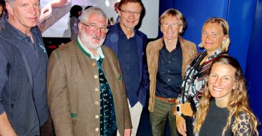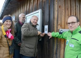 - l. Alexandra Nawroth, Umweltbeauftragte des AUV; Claus Linke, Chiemseeagenda; Josef Mayer, erster Bürgermeister von Rimsting und AUV-Vorsitzender; Dirk Alfermann, Gebietsbetreuer Chiemsee – beim Anbringen des ersten QR-Codes zum Erforschen der Vogelwelt in Oberbayern
