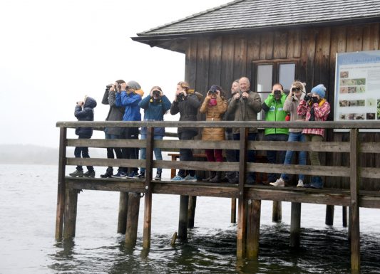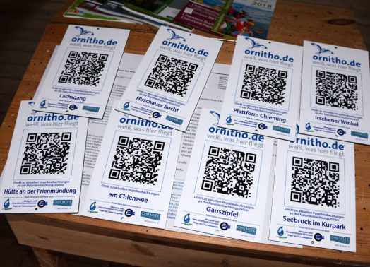 Dirk Alfermann, ein hervorragender Kenner der Vogelwelt am Chiemsee, war es, der die Initiative ergriff und die QR-Codes mit Unterstützung des Abwasser- und Umweltverbands Chiemsee (AUV) anfertigen ließ. Weitere QR-Codes Tafeln werden in Kürze an den Naturbeobachtungsstationen Turm am Ganszipfel, Turm im Kurpark Seebruck, Beobachtungsplattform Chieming, Turm in der Hirschauer Bucht, Turm am Lachsgang und Turm am Irschener Winkel installiert. Dann können sich auch dort Naturinteressierte einen Überblick über die Vogelbeobachtungen verschaffen, die in den jeweils letzten zwei Wochen im Umkreis von ein bzw. zwei Kilometern an www.ornitho.de gemeldet wurden. Melden kann jeder Bürger, der sich auf dieser Internet-Plattform registrieren lässt. Inzwischen sind es deutschlandweit über 25.000 Personen, die mittlerweile mehr als 35 Millionen Vogelbeobachtungen gemeldet haben. Seit dem Start des Portals im Herbst 2011 sind bislang mehr als 40.000 Vogelbeobachtungen für den Bereich des Chiemsees gemeldet worden. Wer mehr über die Vogelwelt am Chiemsee erfahren möchte, dem empfiehlt Dirk Alfermann, Gebietsbetreuer Chiemsee, die ganzjährig stattfindenden Vogelführungen. Termine sind im Internet unter www.dernaturaufderspur.de zu finden und in den Tourist-Informationen als Faltblatt erhältlich; ebenso liegen sie an den Naturbeobachtungsstationen aus.