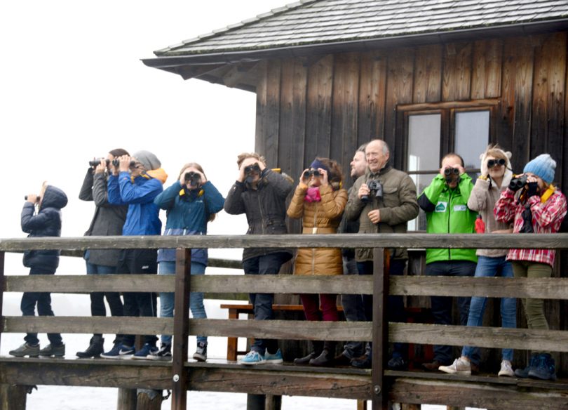 Zehn Schüler der Umwelt-AG des Priener Ludwig-Thoma-Gymnasiums (LTG) geleitet von der Biologie-Lehrerin Kristina Reicheneder, konnten dies im Beisein von Dirk Alfermann (Gebietsbetreuer Chiemsee), der AUV-Umweltbeauftragten Alexandra Nawroth, dem Gebietsbetreuer der Eggstätt-Hemhofer Seenplatte und Seeoner Seen Patrick Guderitz, der Vogel- und Naturführerin Christine Haslbeck und Claus Linke von der Chiemseeagenda, nach dem Anbringen der QR-Code Tafel direkt einmal ausprobieren. Gemeinsam erforschten sie die aktuelle Vogelwelt, die sich auf ihrem Smartphone im Detail sehen konnten. Hierzu nutzten sie zudem die eigens von ihren Lehren erarbeiteten Beobachterpässe für Wasservögel, die im Rahmen des Projekts „Biodiversität im Schulalltag“ (BISA) entstanden sind. Das BISA-Projekt wurde vom LTG zusammen mit dem Gymnasium Kufstein entwickelt und soll die Artenkenntnisse der Schüler evaluieren und verbessern. Das LTG wurde für das BISA-Projekt bei Science in Europe Ungarn ausgezeichnet und stellt die Methoden europaweit von Slowenien über die Schweiz bis Hamburg vor.