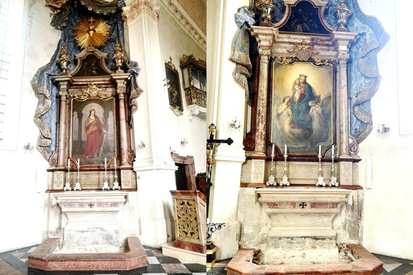 In der Priener Pfarrkirche “Mariä Himmelfahrt” gibt es noch immer eine kleine Baustelle. Was mit einer Renovierung der Seitenaltäre begann, hat sich zu einer richtigen Baustelle entwickelt. Der Marienaltar ist inzwischen wieder repariert und gereinigt. Jetzt muss nur noch die Stufe restauriert werden, dann wäre die Baumaßnahme abgeschlossen. Das eine ist der Plan, das andere die Realität.