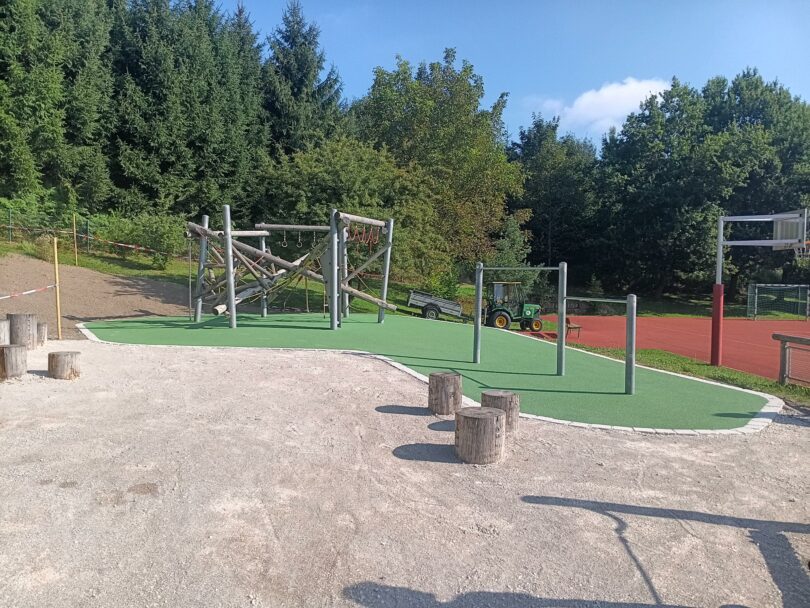 Bericht und Foto: Stadt Traunstein – Kein Riesel mehr: Der Fallschutz am Kletterspielgerät und am Zweifach-reck wurde erneuert und besteht nun aus Kunststoff. So werden keine Steine mehr auf den Hartplatz getragen, was dort stets einen zusätzlichen Reinigungsaufwand bedeutete.