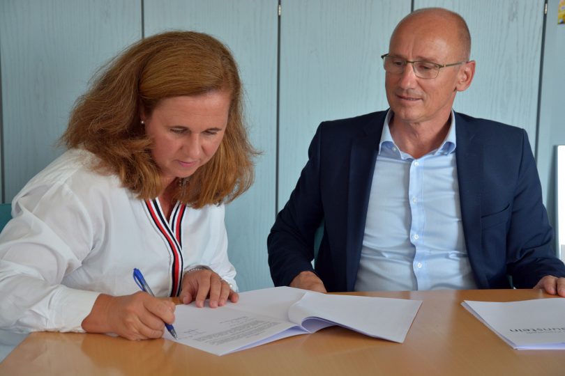 Foto: Vertragsunterzeichnung von Alexandra Birklein mit Oberbürgermeister Christian Kegel. Fotorecht: Pressestelle Stadt Traunstein
