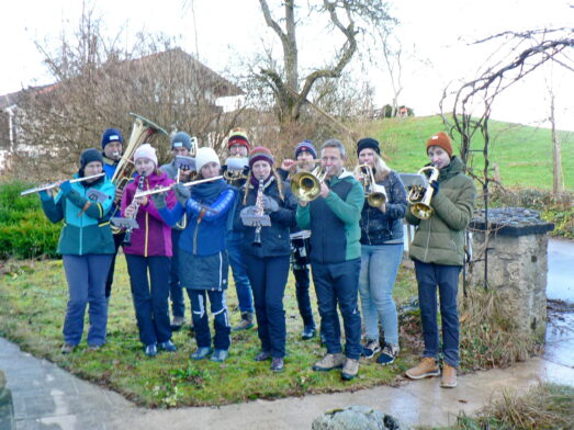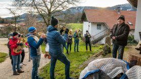 Musikalische Grüße zum Jahreswechsel haben auf dem Samerberg eine lange Tradition. Insgesamt in vier Gruppen machen sich die Musikantinnen und Musikanten heute auf den Weg, um in möglichst alle 74 Ortschaften der Gemeinde Samerberg zu kommen. Sonniges Wetter begünstigt dabei die zum Teil langen Fußmärsche. Die ersten Eindrücke zeigen eine Musikantengruppe in Fading.