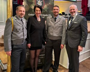 Der zweite Bürgermeister von Aschau Michael Andrelang (rechts) und Gemeinderätin Christine Parigger (zweite von links) vertraten die Gemeinde Aschau beim Neujahrsempfang 2024 der Gebirgsjägerbrigade 23 im Alten Königlichen Kurhaus in Bad Reichenhall. Alle Patengemeinden der Kompanien waren zu diesem Empfang geladen. Der Kompaniechef der dritten Kompanie des Gebirgsjägerbataillons 231 Major Marcel Zens (zweiter von rechts) und der Kompaniefeldwebel Oberstabsfeldwebel Klaus Fischer (links) kümmerten sich beim Empfang um die Gäste und Paten aus dem Chiemgau.