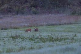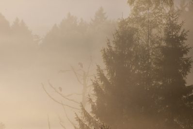 Dabei konnte auch schon öfters ein Schwarzstorch beobachtet werden. Der sehr scheu und heimlich im Wald lebende und brütenden Schwarzstorch gilt als selten und man darf sich glücklich schätzen ihn einmal zu Gesicht zu bekommen. Jakob war schon an den letzten 3 Tagen um 4 Uhr morgens freiwillig! aufgestanden, um mit Papas Kamera sein Glück zu versuchen. Noch in völliger Dunkelheit und gut getarnt wurden je nach Windrichtung und zu erwartendem Licht Fotoverstecke möglichst lautlos angesteuert. Dann hieß es regungslos im nassen Gras kauernd und auch etwas frierend zu warten. Die Geräusche der Nacht und der heraufziehende Morgen mit herrlichen Nebelstimmungen bleiben Vater und Sohn unvergesslich und lies die gemeinsame Wartezeit voller Spannung nicht lange werden.