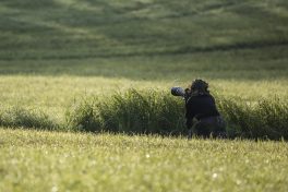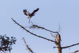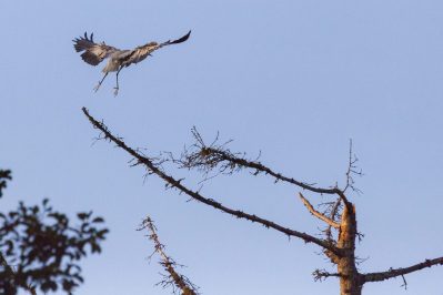 Nach anfänglichen erfolglosen Warten wurde vorsichtig das Versteck gewechselt und schnell wurde ein frei stehender toter Baum neben den ersten Sonnenstrahlen auch von einem Falken besucht. Der durfte aber nicht lange verschnaufen, denn zwei ungestüm lärmend anfliegende und im gebiet wohl bekannte Graureiher beanspruchten die Aussicht für sich. Ausgiebige morgendliche Federpflege folgte und waren vom ca. 50m entfernten Tarnversteck genüsslich zu beobachten. Die Stille wurde nur durch die leisen Auslösegeräusche von Jakobs Kamera durchbrochen, der ganz in seinem Element war.