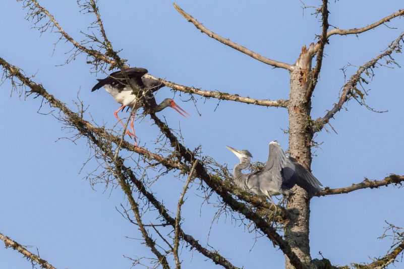Nachdem wir am Vortag schon einmalmal völlig überrascht zwei Schwarzstörche im goldenen Gegenlicht beobachten konnten, rechneten wir nicht damit, heute noch einmal das Glück zu haben, die scheuen Tiere anzutreffen. Daher war die Freude und Überraschung riesig, als ein Schwarzstorch über die Fichtenwipfel einschwebte und in wohlberechneter Landekurve Kurs auf unseren Baum nahm. Unbeeindruckt von dem mittlerweile noch verbliebenden einen Graureiher nahm er um Balance ringend Platz. Ein herrliches Tier! Nach kurzer Diskussion der beiden Vögel, die der Schwarzstorch von oben herab eindeutig für sich entschied, wurden durch anfahrende LKW’s die Idylle leider jäh beendet.