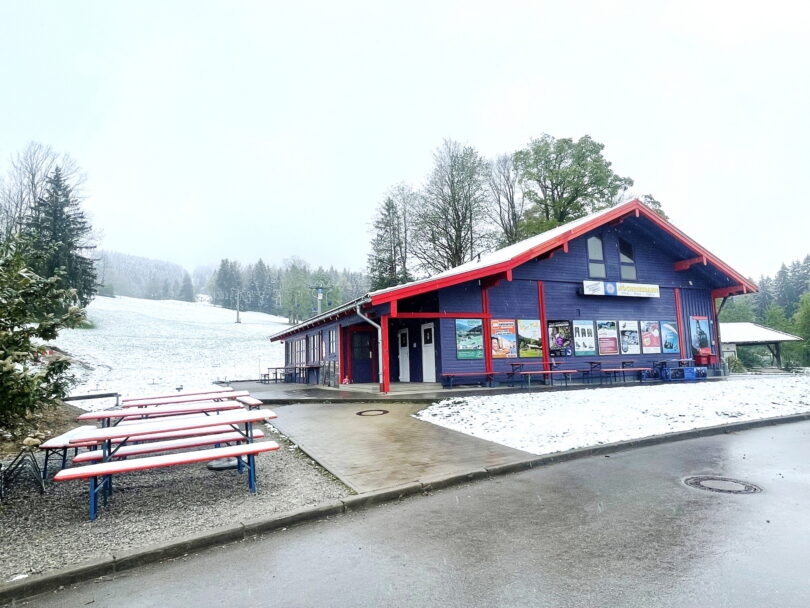 Ersten schönen Wander- und Sonnentagen auf dem Samerberg mit Nutzungsmöglichkeiten der Hochriesbahn für einen aussichtsreichen Ausflug folgten jüngst entsprechend der April-Launen regnerische Tage. Zuweilen gab es auch Schneefall bis ins Tal. Wie unsere aktuelle Donnerstags-Aufnahme zeigt, hat sich der frische Schnee bis zur Talstation der Hochriesbahn eingestellt. Die aktuellen Fahrzeiten der Hochriesbahn sind mittwochs bis sonntags, Montag und Dienstag sind Ruhetage. An Betriebstagen fährt der Sessellift von 9.30 Uhr bis 17 Uhr und die Pendel- und Kabinenbahn fährt von 10 Uhr (erste Bergfahrt) bis 17 Uhr (letzte Talfahrt). Nähere Auskünfte gibt es auf der Seite www.hochriesbahn.de.