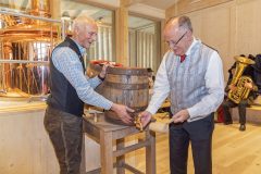 Museumsdirektorin Dr. Monika Kania-Schütz sieht den Besucherservice genauso wie die Vermittlungsarbeit aufgewertet und fand vor allem Dankesworte: “Schon heute möchte ich mich bei den Politikern des Bezirkstags bedanken […]. Denn hätten Sie nicht den Beschluss gefasst und die Mittel freigegeben, hätten wir nicht mit der Arbeit beginnen können. […] Sie machen das Museum damit zukunftsfähig.” Beim anschließenden Brauergespräch zwischen Josef Mederer, der einst das Brau- und Mälzerhandwerk lernte, und der Pächterfamilie Schubert von der Brauerei Karg erfuhren die Anwesenden so manch Interessantes über die Biere, die in der Glentleitner Brauerei künftig regelmäßig gebraut werden. Unter den Namen “Herzogstand Hell”, “Jochberg Dunkel” und “Schafreiter Bock” werden die ersten Gerstensäfte zum Ausschank kommen. Das Glentleitner Bock-Bier beschrieb Biersommelière Victoria Schubert als mahagonifarben, mit einem an Brot und Malz erinnernden Geruch, der im Antrunk einen malzbetonten Körper mit Karamellnoten habe und im Abgang eine leichte Hopfenbittere aufweise, die leicht holzartige Aromen bringe. Da lief einigen Gästen wohl schon das Wasser im Mund zusammen, und so war die Freude groß, als Mederer den ersten Glentleitner Bock schließlich anstach und ausschenkte.